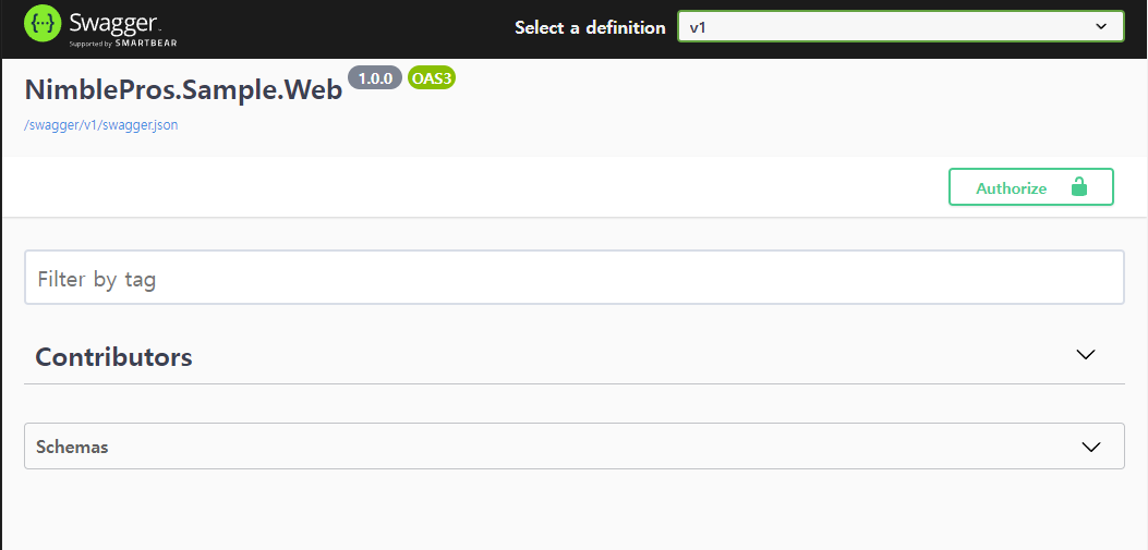 (5) 기본적으로 NimblePros.Sample.Web 프로젝트가 시작프로젝트로 구성되어 있으므로, 시작 버튼을 클릭하여 시작해 볼 수 있습니다. 그럼 다음의 스웨거 화면을 볼 수 있습니다.